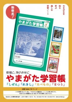 2020.11.4 やまがた学習帳 「やまがた学習帳」は自然、食べ物、祭り、歴史の全4種。それぞれのテーマに沿った山形県内の特産物や、文化遺産等を4ページに渡って詳しく紹介。 児童が、自分たちの住む場所の魅力や歴史文化への理解を深め、地元への関心がさらに高まる内容です。また、県内外へのお土産品としても最適。子供も大人も使える、使い勝手の良い5mm方眼紙のノートです。 売上の一部は「やまがた社会貢献基金」として山形県に寄付され、購入することで地域貢献も担う商品です。