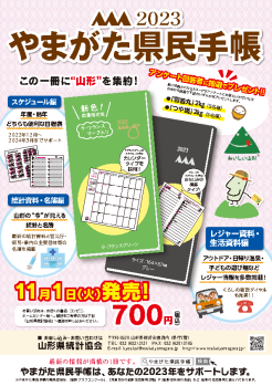 2023.10.30 やまがた県民手帳2024 県内各書店で11月1日(水)より発売 価格 700円(税込) ・ネイビー ・ラ・フランスグリーン <内容> スケジュール編 年度・西暦どちらも便利な日程表 統計資料・名簿編 山形の‘今’が見える統計と名簿 レジャー資料・生活資料編 アウトドア・日帰り温泉・子どもの遊び場など多数掲載 ※ご用命の際は直接ご連絡ください